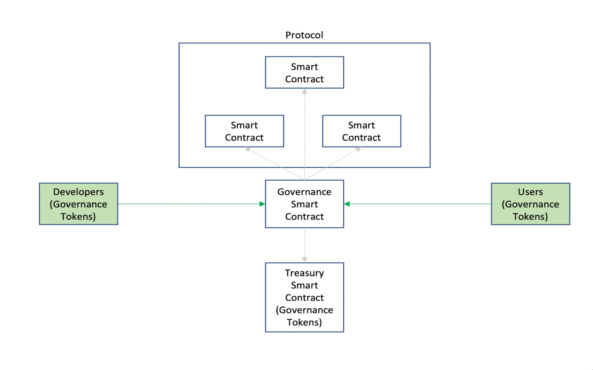 The governance tokens provide decentralized decision-making mechanism for DAO members to interact with the governance protocols and control the smart contracts underlying the protocol (see Chart 3). Although the functionality of governance tokens and governance smart contracts vary for each DAO, governance tokens generally provide a means in which proposals can be raised and voted on regarding DAO operational decisions and governance smart contracts generally provide a means to alter variants in the smart contracts of the underlying protocol and to manage the DAO treasury.